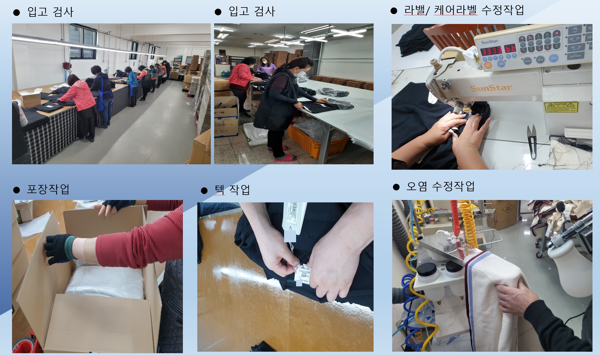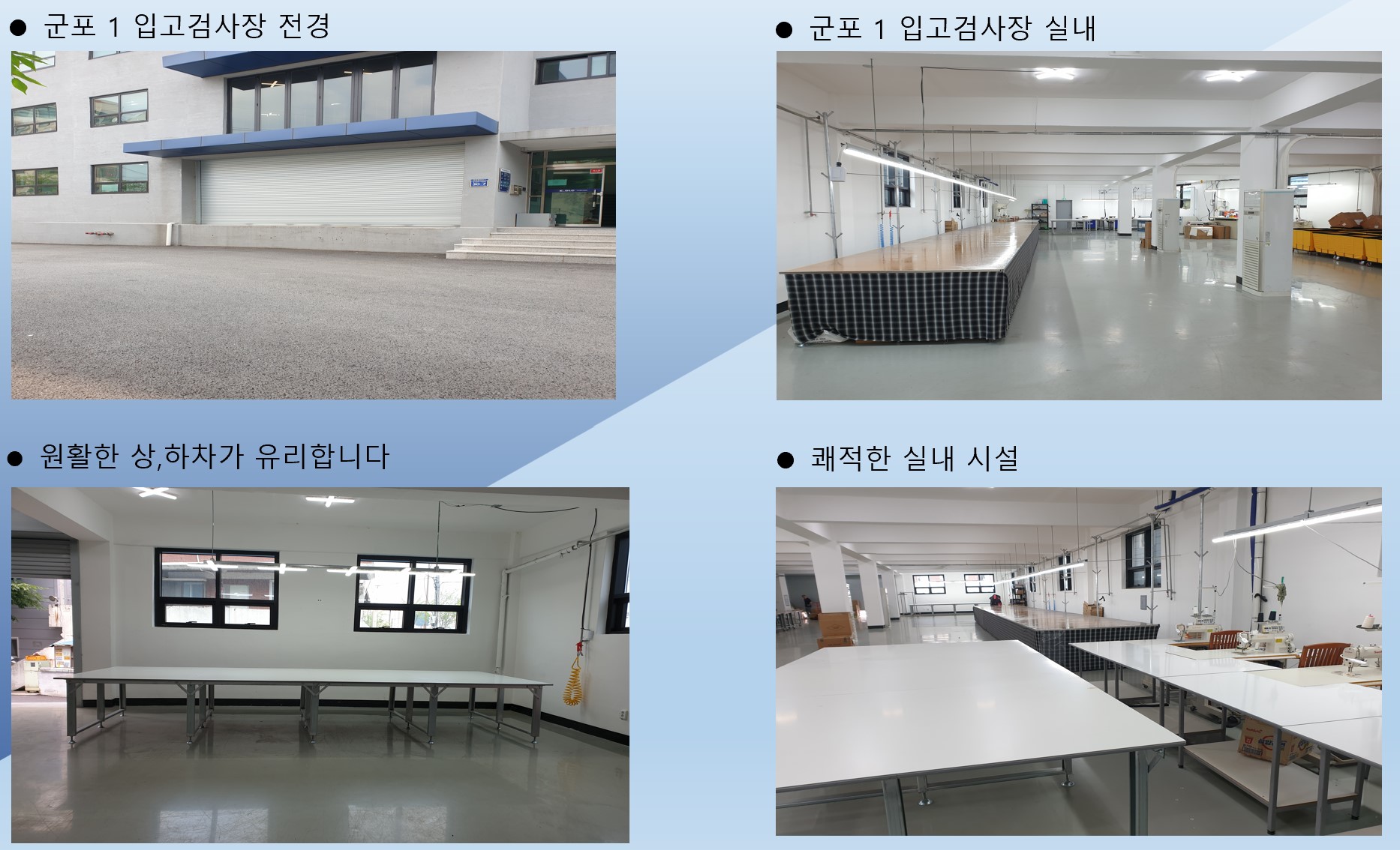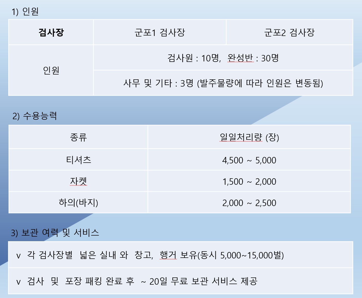 현재 2곳의 입고검사장을 통해서 국내외 생산된 의류 및 악세서리 제품의 검사, 라벨교환, 아이롱, 수선, 포장, 배분 등의 완성 작업을 진행하고 있으며 특히 고객에게 고품질, 저비용, 빠른 납기 와 최상의 서비스를 제공하여 고객의 요구에 맞게 제품의 품질 향상에 최선을 다하고 있습니다.