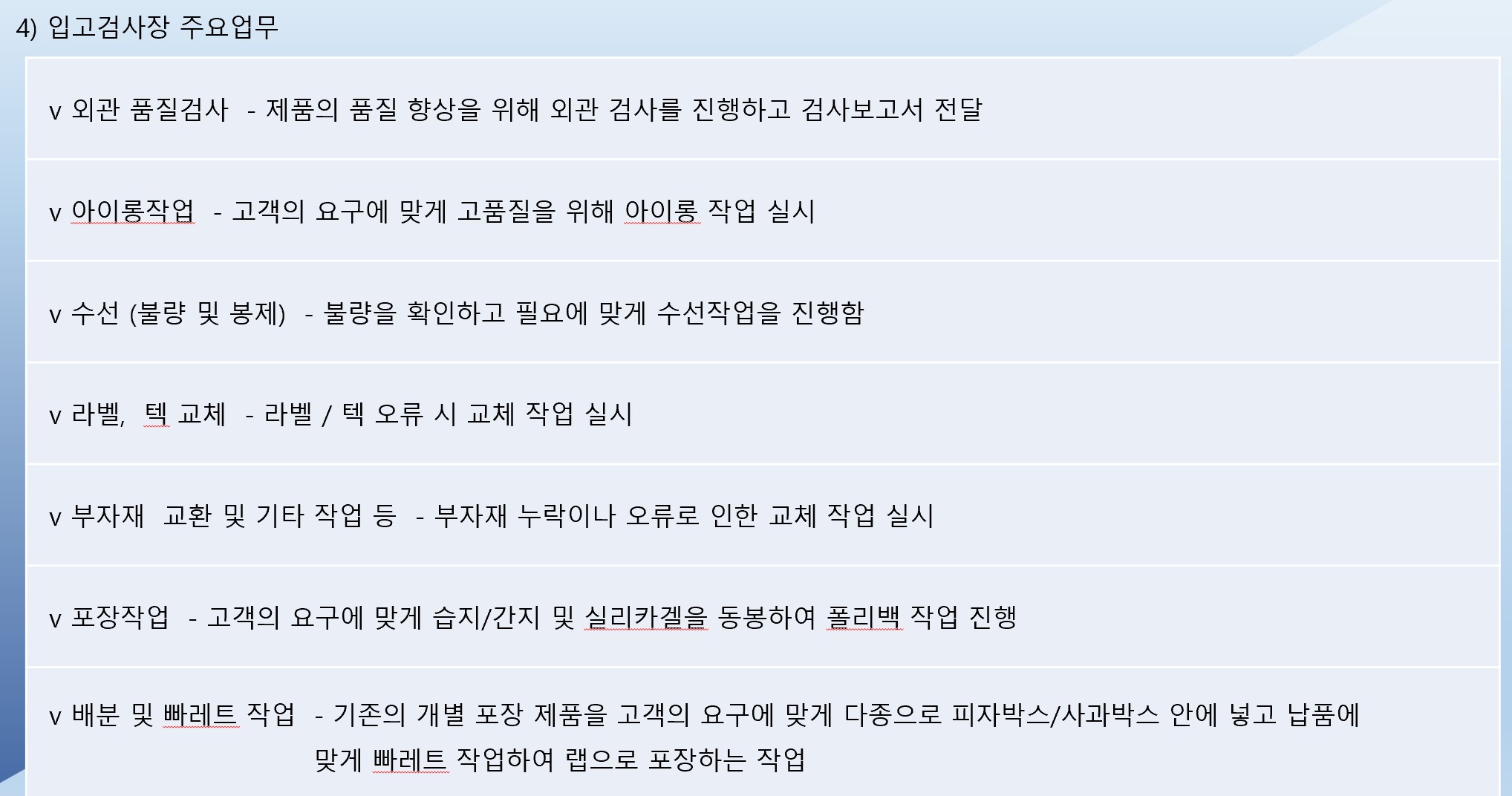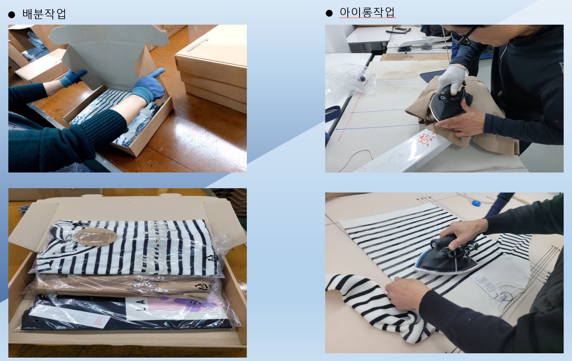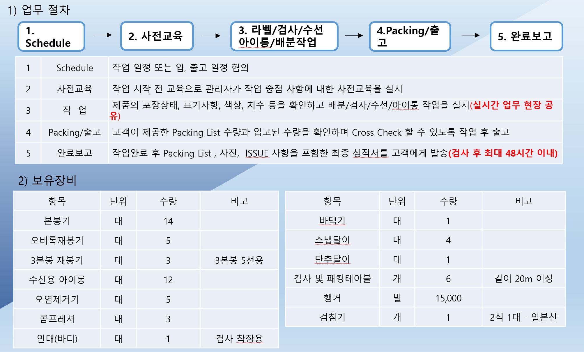 현재 2곳의 입고검사장을 통해서 국내외 생산된 의류 및 악세서리 제품의 검사, 라벨교환, 아이롱, 수선, 포장, 배분 등의 완성 작업을 진행하고 있으며 특히 고객에게 고품질, 저비용, 빠른 납기 와 최상의 서비스를 제공하여 고객의 요구에 맞게 제품의 품질 향상에 최선을 다하고 있습니다.